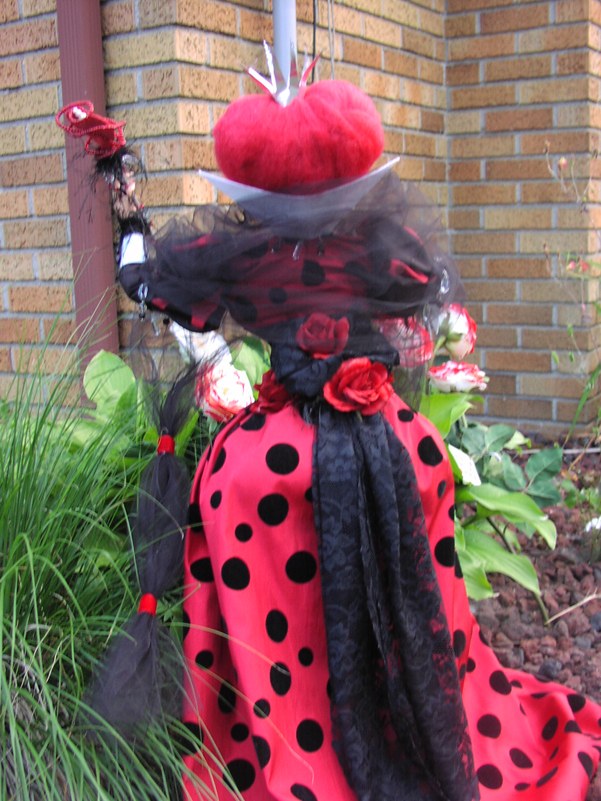 The Queen of Hearts face and hands were sculpted with Sculpty clay and painted with acrylic paints, she has a wire and wood armature body. She stands 31.5" tall
